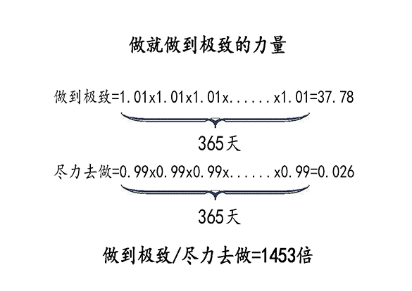 我們倡導員工做任何一件工作,“做,就做到極致”,把事情做細、做專、做到極致,永遠以積極的思維方式,滿懷熱情,付出不亞于任何人的努力,把自己的潛能發揮到極致,人生一定會碩果累累、幸福美滿。